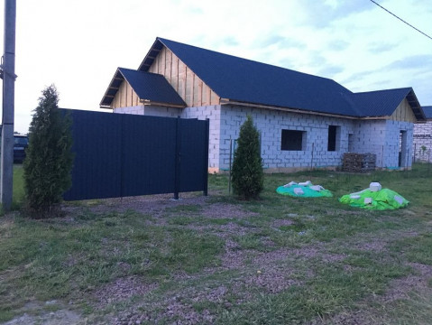 Изначально планировался дом на две семьи по 50 м2 половина. Новым владельцам можно планировать по своему желанию. Дом построен летом 2022 года. фундамент, стены, крыша. Материал на крыше покрыт качественным металопрофилем цвет графит Ral 7024. Новые ворота в цвет крыши. Забор временный сетка рабица. Документы, разрешение на строительство в полном порядке. Участок ровный, прямоугольный есть молодой фруктовый сад.