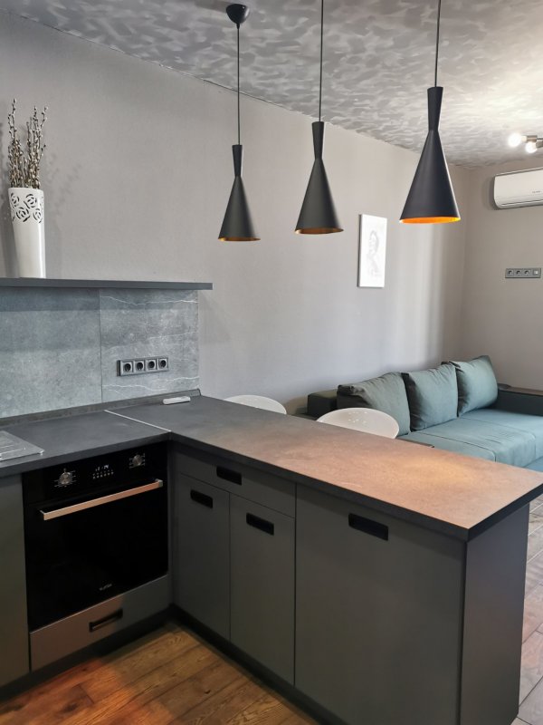 Аренда новой 1ком.квартиры -студии в новом ЖК "Караваевые Дачи" в тихом районе на Соломенке по ул. Полевая 73. Квартира с дизайнерским ремонтом в стиле лофт «50 оттенков серого».