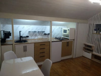 Имеется все необходимое для долгосрочного проживания. Кухонный гарнитур, большая двуспальная кровать, просторный санузел, места хранения одежды. Есть стоянка для автомобиля.