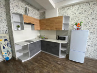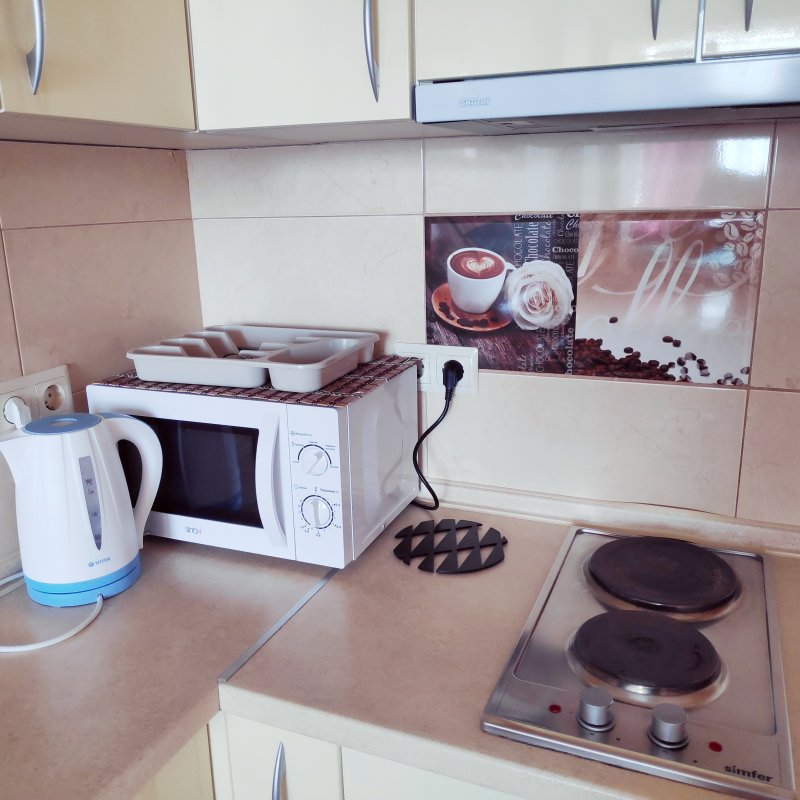 Кухня со всеми принадлежностями, электроплита, микроволновка, посуда, вытяжка, холодильник, электрочайник.
