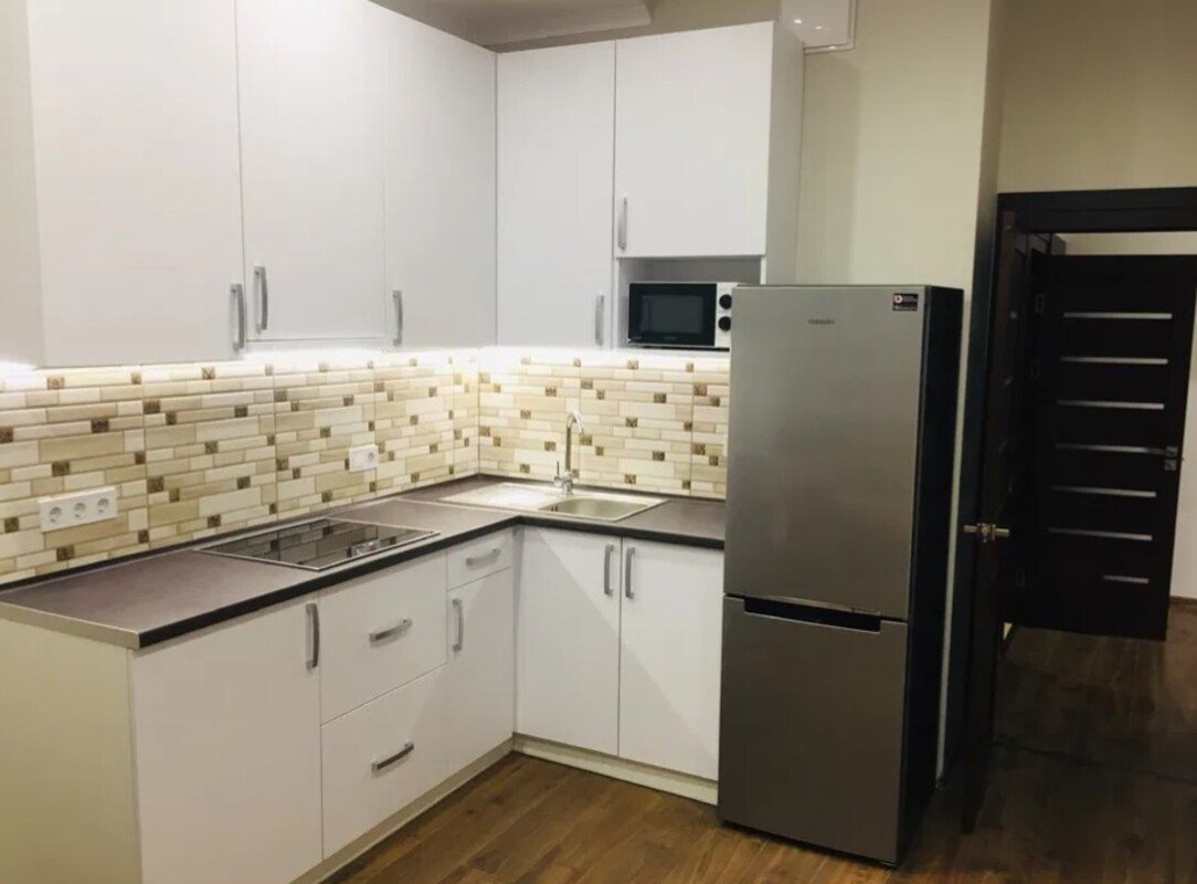 - Встроенная варочная поверхность - Духовка - Микроволновая печь - Вытяжка - Холодильник - Телевизор - Раскладной диван - Вентиляция - Отдельно стоящий стол с деревянными мягкими стульями