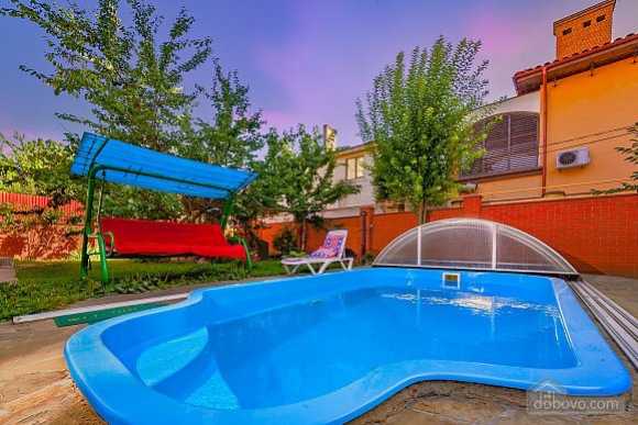 Суперстильный новый дом на 14 ст Фонтана с видом на Море! (№ 130) Стильный современный дом - первая линия от моря - 320/180/50 находится на 5 сотках земли, в доме 5 комнат, 4 спальни, 4 санузла, большая кухня - студия, современные отделочные материалы, современная мебель и бытовая техника ведущих производителей мира. В каждой комнате 2-х спальная кровать, красивые шкафы-купе, плазменный телевизор, кондиционер. В доме две террасы, одна из которых с выходом на бассейн, барбекю. Возможно размещение 8-10 человек. Закрытый двор, не просматриваемая территория, пульт охраны, место для двух автомобилей во дворе, WI-FI, кабельное телевидение. Дом находится возле знаменитого пляжа "Ривьера», до Аркадии 5 -10 минут езды на автомобиле. Комфортных спальных мест для 10 гостей (с дополнительными для 11 гостей).