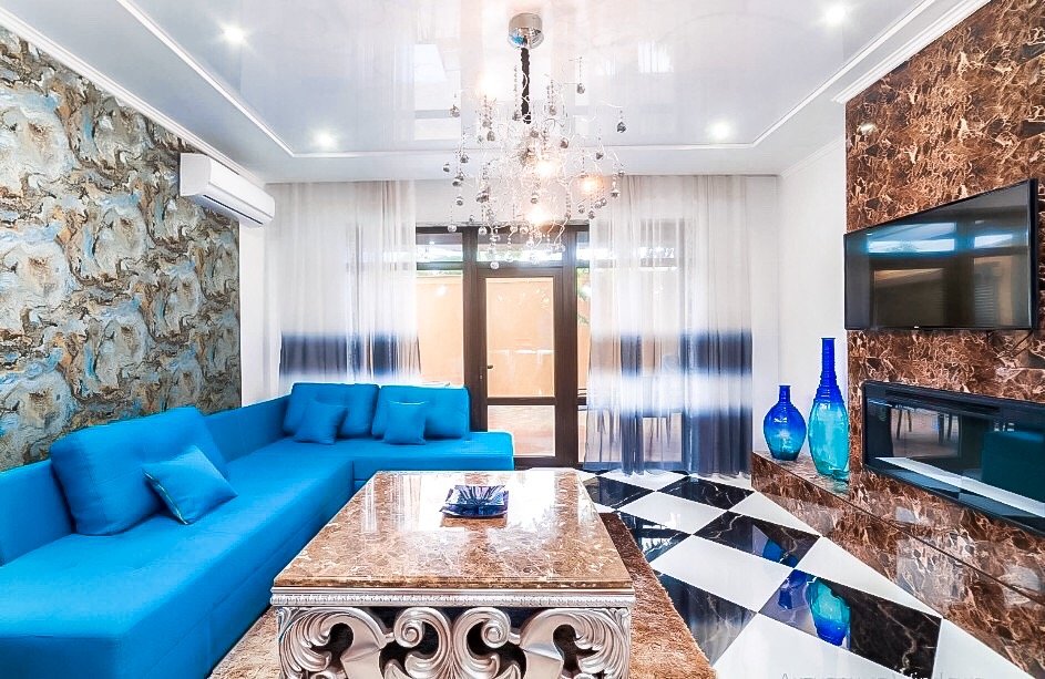 Роскошная гостиная 60 м2, 8 спален, 7 санузлов, участок 4 сотки, бассейн на улице, место для 2 автомобилей и еще 1 в гараже. Авторский дизайн, итальянская мебель, всё очень стильно, модно и со вкусом.