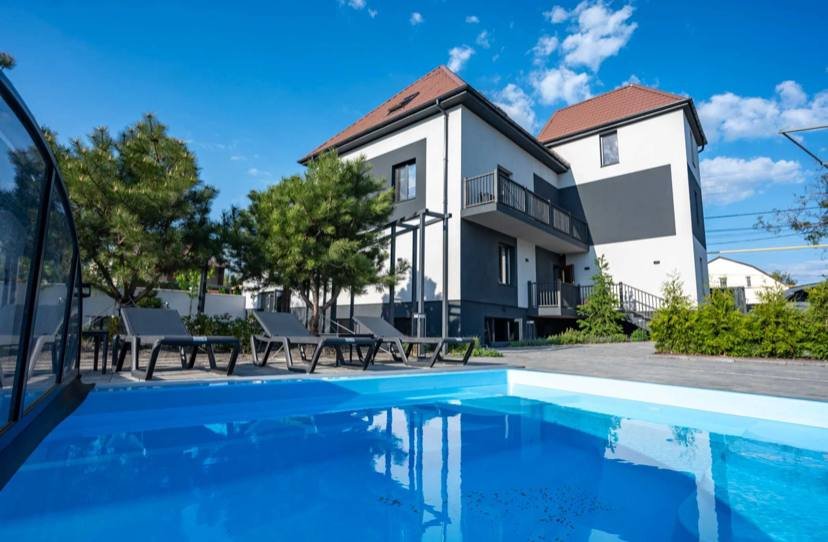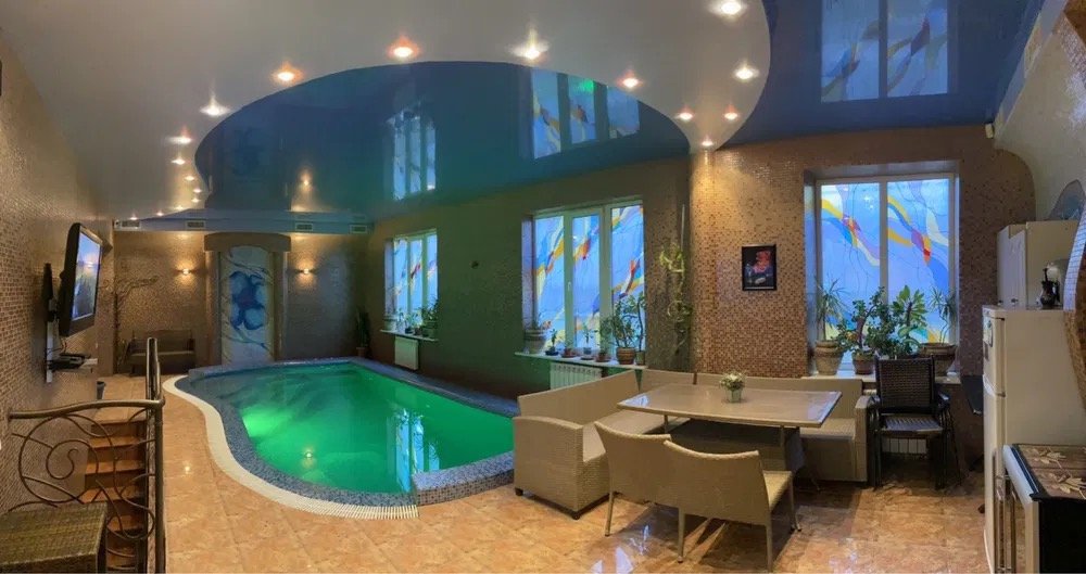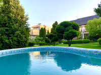 собственный бассейн для комфортного отдыха, сауна, просторный банкетный зал для проведения праздников и мероприятий на 30 гостей, 3 этажа с номерами, каждый из которых имеет собственный санузел.