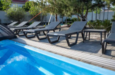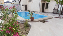 Банкетный зал с выходом в бассейн. С бассейна выход на территорию зону отдыха. На улице есть шезлонги для загара, На заднем дворике уличные столы, мангал. Сам бассейн большой.