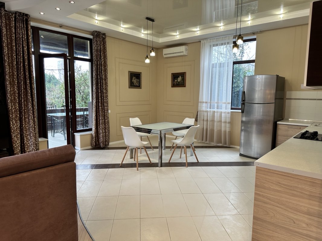 Большой комфортабельный дом 200 кв м общей площадью находится на улице Леваневского в 15 мин ходьбы от Моря! 3 спальни с кроватями и одна спальня с большим и удобным раскладывающимся диваном, гостиная 40 кв м, 2 санузла, 5 соток благоустроенный двор с зоной барбекю и открытым бассейном. Комфортных спальных мест для 10 гостей (с дополнительными для 11 гостей).