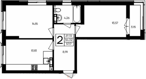 В продаже имеются квартиры в жилом комплексе "Семисчастье" премиум-класса. Общая площадь составляет 57,17 кв.м., при этом кухня - 13,13 кв.м. Высота потолков достигает 2,7 м.