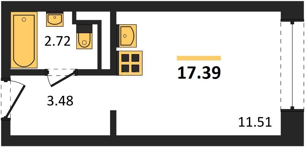 В продаже имеются квартиры в жилом комплексе "Олимпия 2.0" премиум-класса. Общая площадь составляет 17,39 кв.м., при этом жилая зона с кухней занимает 11,51 кв.м. Все окна выходят на одну сторону. В квартире есть лоджия и санузел. Высота потолков достигает 2.7 м.