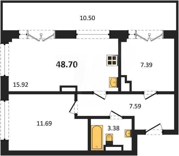 В продаже имеются квартиры в жилом комплексе "Олимпия 2.0" премиум-класса. Общая площадь составляет 48,7 кв.м., при этом жилая зона с кухней занимает 15,92 кв.м. Все окна выходят на одну сторону. В квартире есть лоджия и санузел. Высота потолков достигает 2.7 м.