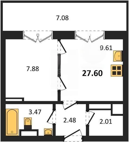 В продаже имеются квартиры в жилом комплексе "Олимпия 2.0" премиум-класса. Общая площадь составляет 27,6 кв.м., при этом жилая зона с кухней занимает 9,61 кв.м. Все окна выходят на одну сторону. В квартире есть лоджия и санузел. Высота потолков достигает 2.7 м.