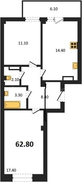 В продаже имеются квартиры в жилом комплексе "Доброгород" премиум-класса. Общая площадь составляет 62,9 кв.м., при этом кухня - 14,4 кв.м. Высота потолков достигает 2,8 м.