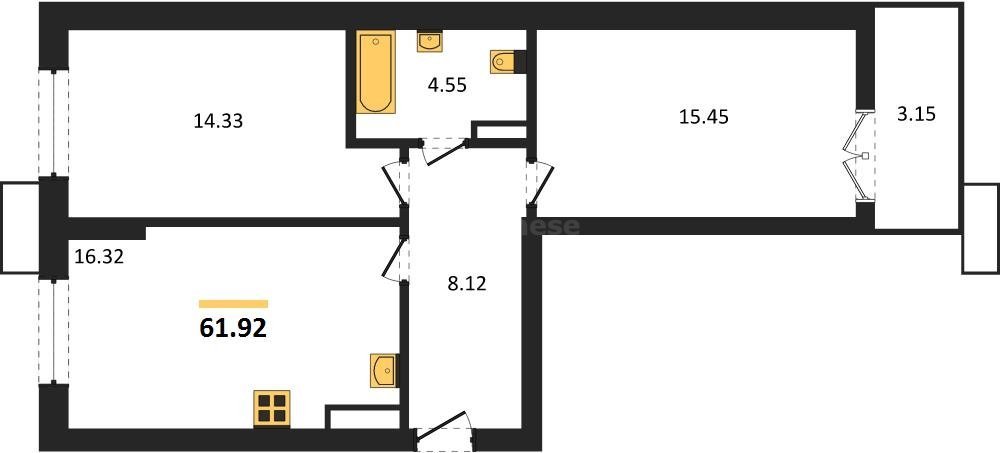 В продаже имеются квартиры в жилом комплексе "Семисчастье" премиум-класса. Общая площадь составляет 61,924 кв.м., при этом кухня - 16,32 кв.м. Высота потолков достигает 2,7 м.