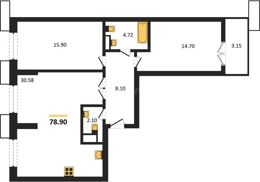 В продаже имеются квартиры в жилом комплексе "Семисчастье" премиум-класса. Общая площадь составляет 78,9 кв.м., при этом кухня - 30,58 кв.м. Высота потолков достигает 2,7 м.