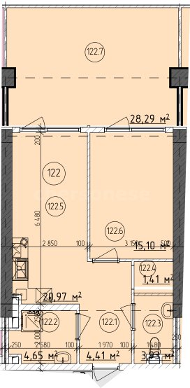 В продаже имеются апартаменты с полной отделкой, бытовой техникой, текстильным инвентарем и мебелью в жилом комплексе "Cosmos Stay" премиум-класса. Общая площадь составляет 66,29 кв.м., при этом кухня занимает 26,44 кв.м. Все окна выходят на одну сторону. В квартире есть лоджия и санузел. Высота потолков достигает 2.9 м.