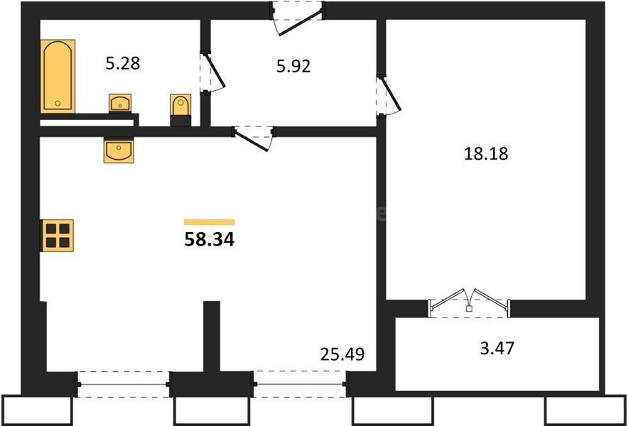 В продаже имеются квартиры в жилом комплексе "Семисчастье" премиум-класса. Общая площадь составляет 58,341 кв.м., при этом кухня - 25,49 кв.м. Высота потолков достигает 2,7 м.
