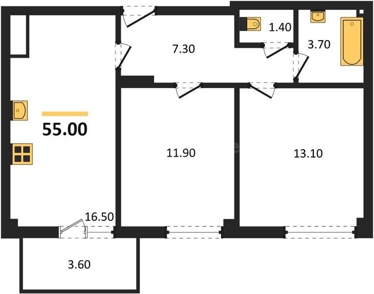 Планировка включает две изолированные комнаты, жилую зону 32 м² и кухню 9 м²