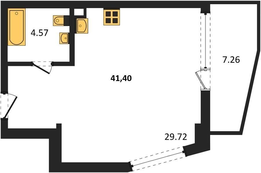 В продаже имеются студио-апартаменты с отделкой в жилом комплексе "Garden" премиум-класса. Общая площадь составляет 41,4 кв.м., при этом жилая зона с кухней занимает 29,72 кв.м. Все окна выходят на одну сторону. В квартире есть лоджия и санузел. Высота потолков достигает 2.7 м.