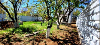 На участке растет много плодовых деревьев: персики, абрикосы, яблони. Участок огорожен забором из камня, имеется калитка и автоматические ворота.