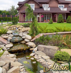 Мощения приусадебной территории и ступеней выполнено гранитом. По всей территории участка выполнена система дренирования, ливневой канализации, система септиков для очищения сточных вод и автополива.
