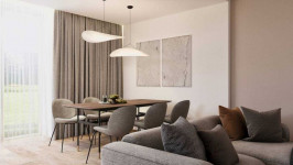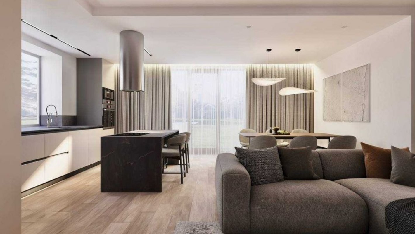 - Велика вітальня з підігрівом підлоги, великим диваном, скляним столом, великим телевізором, кондиціонером вбудованою кухнею та технікою.