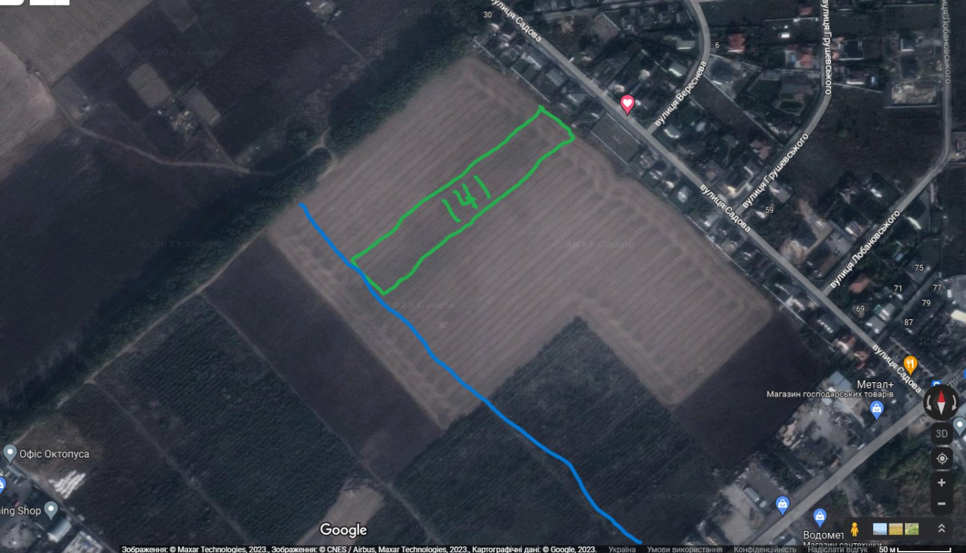 - Ширина ділянки від дороги – 35 метрів. На ділянці росте молодий садок (плодоносить). Кущі смородини, малини та ін.