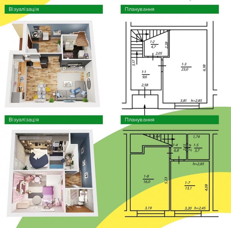 На першому поверсі кухня-студія 19 кв. м. та санвузол 4,2 кв. м. На другому: простора спальня 17,9 та санвузол 4,3 кв. м. (можна зробити гардеробну).