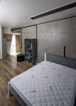 Интерьер выполнен в концепции лакированного бетона — современно, минималистично и эффектно. В квартире установлены кондиционер, стиральная машина, встроенный холодильник. Санузел с душевой кабиной.