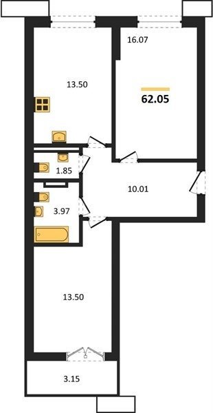 В продаже имеются квартиры в жилом комплексе "Семисчастье" премиум-класса. Общая площадь составляет 62,051 кв.м., при этом кухня - 13,5 кв.м. Высота потолков достигает 2,7 м.