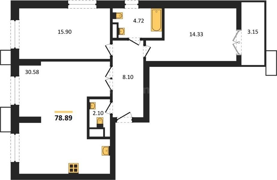 В продаже имеются квартиры в жилом комплексе "Семисчастье" премиум-класса. Общая площадь составляет 78,9 кв.м., при этом кухня - 30,58 кв.м. Высота потолков достигает 2,7 м.
