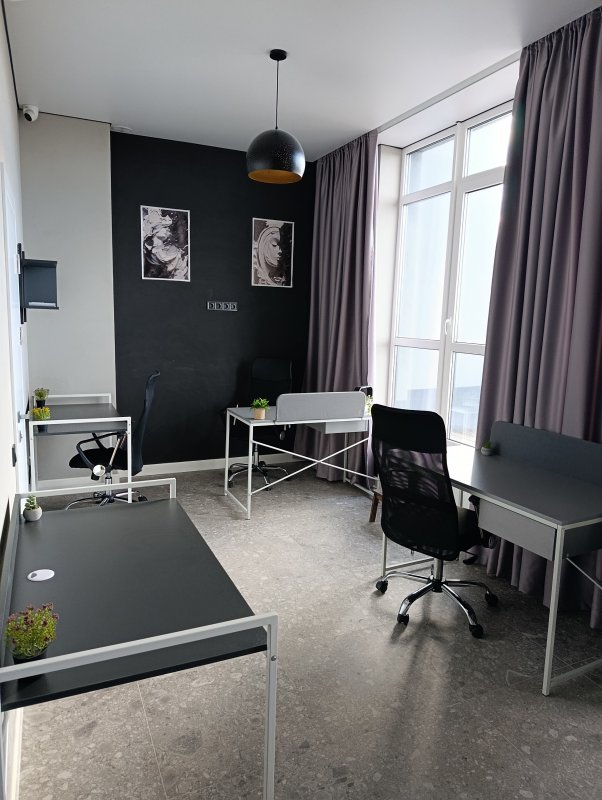 5 оборудованных рабочих мест, зона отдыха с диваном и зона кухни.