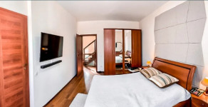 Вилла в 3 уровня, 4 спальни. Из окон всех 4 комнат Вы постоянно сможете наслаждаться видом прекрасного Черного моря, из всех спален выход на террасы, открытый бассейн, джакузи которая может быть наполнена как прохладной, так и теплой водой в вечернее время, шезлонги, зоны отдыха в окружении зеленых лужаек и ландшафтного дизайна. Также есть сауна с комнатой отдыха и возможностью окунаться в бассейн. В холле есть каминный зал с двумя раскладывающимся диванами. кухня. В комнатах на третьем этаже душевые кабины, на втором этаже ванные. Одна комната на втором этаже двухкомнатная, кроме кровати есть еще раскладывающийся диван и небольшая оборудованная кухня. Комфортных спальных мест для 14 гостей (с дополнительными для 17 гостей). Возможны проведения торжественных мероприятий, корпоративов, свадеб. Цена оговаривается.