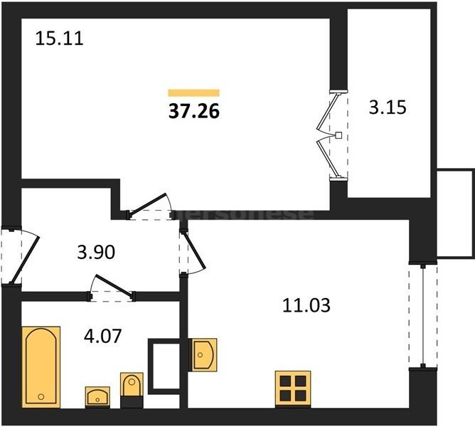 В продаже имеются квартиры в жилом комплексе "Семисчастье" премиум-класса. Общая площадь составляет 37,261 кв.м., при этом кухня - 11,03 кв.м. Высота потолков достигает 2,7 м.