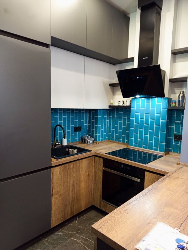 Кухня — МДФ фарбований, кам’яна стільниця та мийка, встановлено фільтр зворотного осмосу.
