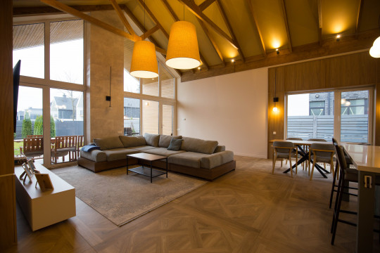 По дизайн проекту выдержана одна цветовая гамма и стиль. Высокие потолки придают особый уют в доме. Продуман и лаконично вписан в интерьер каждый метр площади. Серьезный подход к деталям ощущается от кухни к котельной.