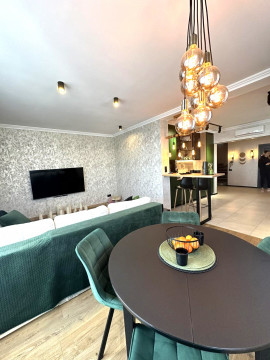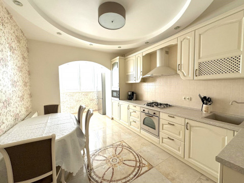 76 м2, дорогой качественный ремонт, хорошая мебель, комнаты раздельные, гостиная и спальня с кроватью, просторная кухня, 2 лоджии, 2 кондиционера, ТВ, духовой шкаф.
