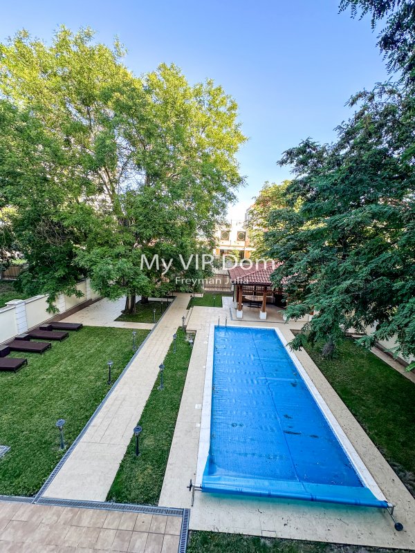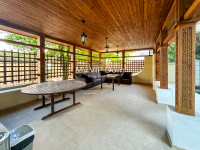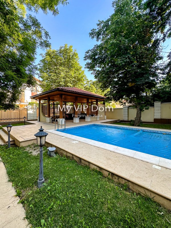 Большой участок в 12 соток располагает на себе большой бассейн, беседку с зоной барбекю, зону отдыха с шезлонгами и паркоместа для авто.