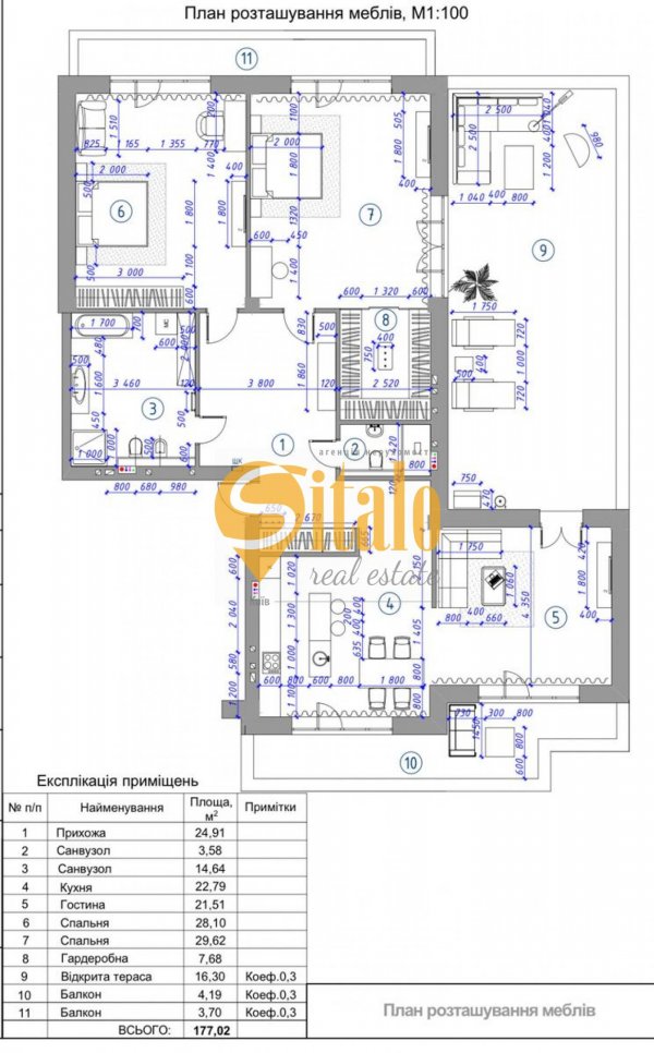 Планування: три окремі кімнати – вітальня 21,5 м², дві спальні 28,9 та 29,6 м²; кухня-столова 23 м²; просторий хол 25 м²; два санвузли (3,6 та 14,6 м²). Два засклені балкони.